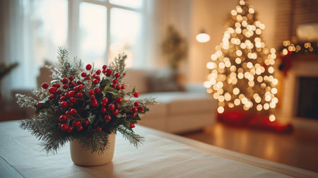A cozy holiday setting features a vase filled with red berries and three glowing candles on a table, with a softly lit Christmas tree creating a warm atmosphere in the background.