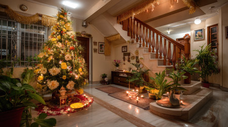 A beautifully arranged indoor space featuring lush plants, soft lighting, and festive decorations, creating a warm and inviting atmosphere for relaxation.
