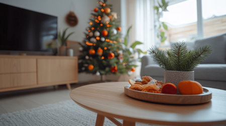 A cozy living room adorned with a beautifully decorated Christmas tree, featuring a festive atmosphere. A tray of snacks rests on a wooden table, inviting warmth and joy.