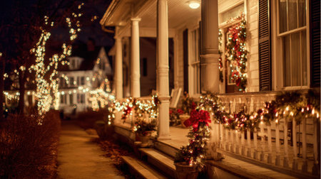 A charming porch illuminated with festive lights and adorned with garlands, creating a warm and inviting atmosphere perfect for holiday celebrations on winter nights.
