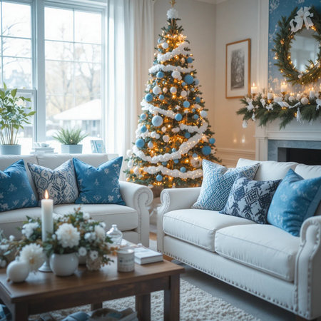 A cozy living room decorated for the holidays, featuring a beautifully adorned Christmas tree, glowing lamps, and candles, creating a warm and festive atmosphere
