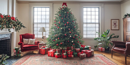 A traditional Christmas tree with classic red and green decorations, surrounded by presents and holiday cheer