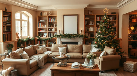 Living room interior with Christmas tree, sofa, coffee table and bookshelf