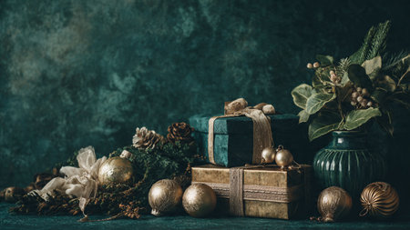 Elegant Christmas composition using deep-green shadows and warm golden reflections.