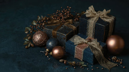 Christmas or New Year composition. Gifts and ornaments on a dark background.