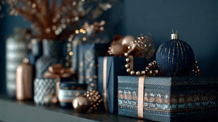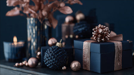 A stylish composition combining dark blue hues with subtle rose-gold decorative accents for a modern festive mood.