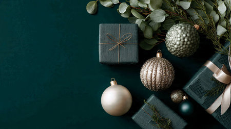 Christmas and New Year still life with green gift boxes, Christmas tree branches, balls and ornaments