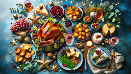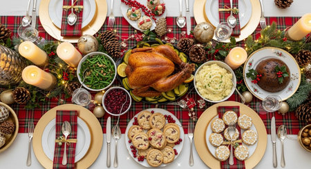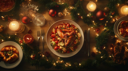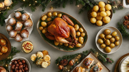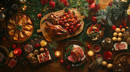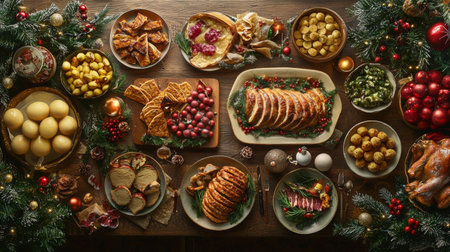 A top-down view of a traditional holiday feast featuring a variety of Christmas dishes, including roasted meats, vegetables, and festive side dishes, decorated with holiday ornaments.