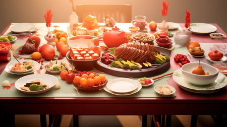 Festive New Year s table with traditional Chinese cuisine featuring salmon, salads and fresh fruits