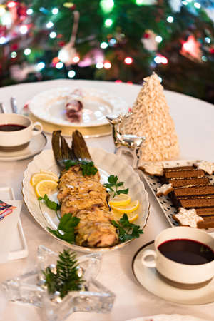 Festive christmas table with traditional food and decorations. Selective focus.