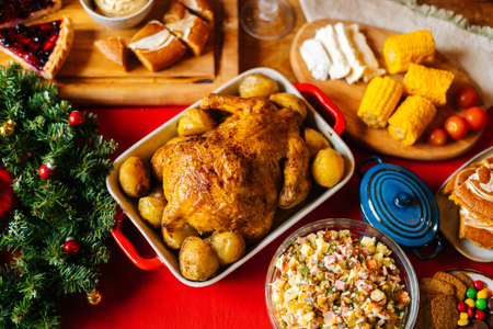 Top view of tasty baked roasted whole fried chicken and salad with christmas decoration on the christmas themed dinner table