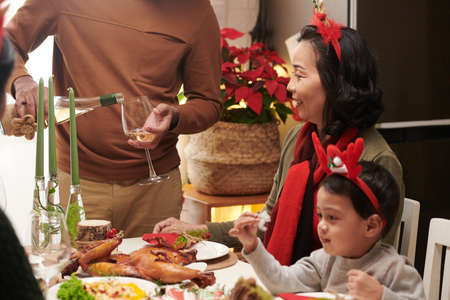 Young woman holding bowl with food while her husband taking piece of meat during family dinner on Christmas day