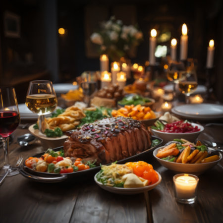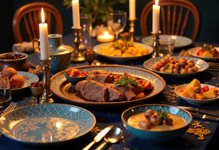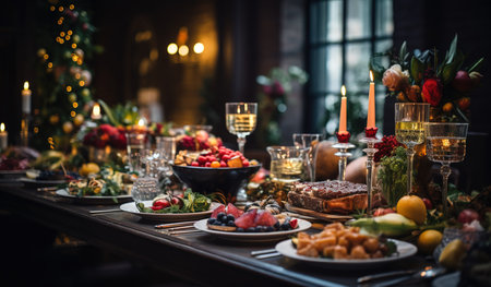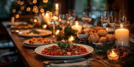 Holiday dinner setting with delicious food and warm candlelight ambiance