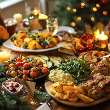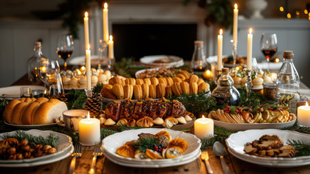 A beautifully arranged Christmas table features delicious festive dishes, flickering candles, and garlands, evoking holiday cheer.