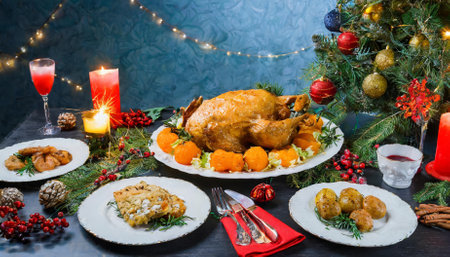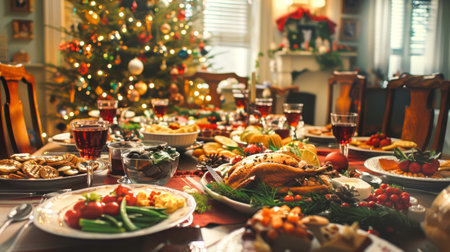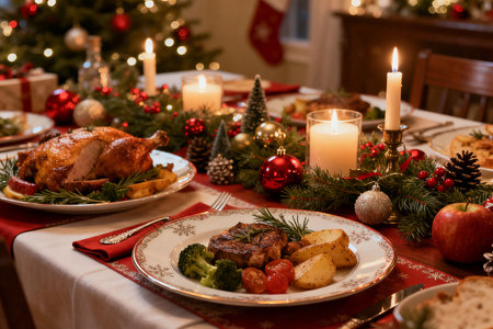 A Christmas dinner table filled with roasted meats, vegetables, and festive decorations, creating a warm and inviting holiday atmosphere.