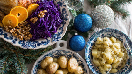 A beautifully arranged holiday feast featuring roasted potatoes, vibrant red cabbage salad with oranges and walnuts, and festive Christmas ornaments.