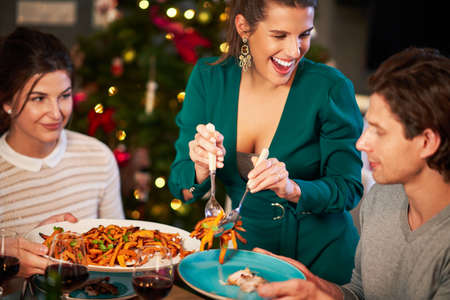 Its time to eat and be merry. Cropped shot of an attractive young woman smiling while having Christmas lunch with her friends at home.