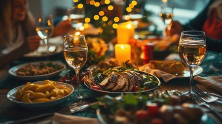 Elegant Christmas table with wine, candles and festive dishes: a warm and cozy holiday celebration