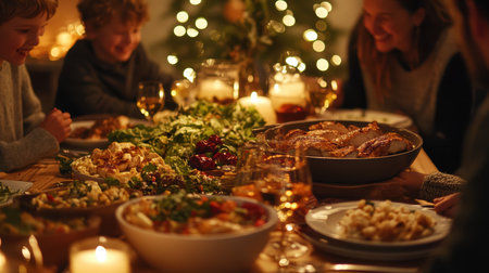 Laughter and joy fill the air as family members come together for a festive holiday dinner, celebrating with a table richly adorned with traditional dishes. A stunning array of food, including savory casseroles, freshly baked bread, seasonal vegetables, and delicious desserts, captures the essence of togetherness. Surrounding the table, elegant decor and flickering candles enhance the warm atmosphere, creating a memorable celebration that honors time-honored culinary traditions.