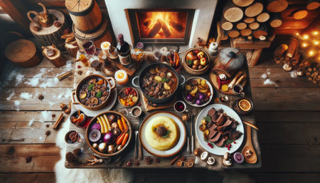 Aerial view of a festive European dinner setting with traditional foods, drinks, and decorations, space for text.