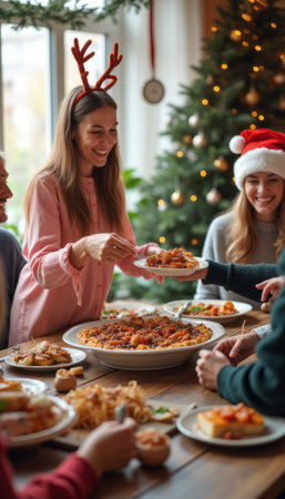 A warm and inviting holiday scene captures a group of friends sharing a delicious meal, filled with laughter and joy. The festive atmosphere is enhanced by Christmas decorations, including a beautifully adorned tree and holiday attire, creating a sense of togetherness and celebration.