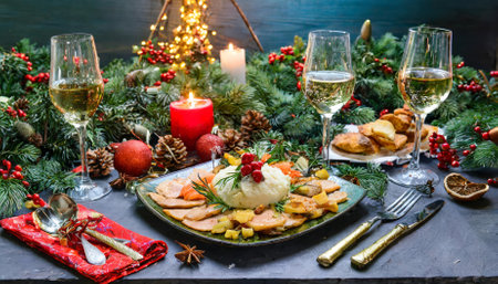 Festive New Year dinner. Traditional Christmas meat food concept