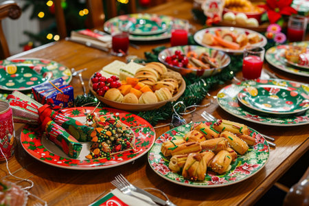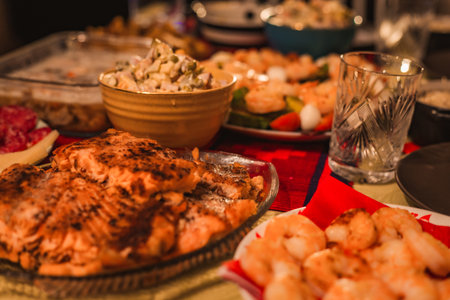 Photo of festive food served on a holiday table, featuring a variety of dishes prepared for Christmas or New Year celebrations. The image conveys warmth, abundance, and joyful family traditions.