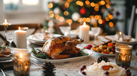 A heartwarming Christmas meal elegantly arranged on a festive table adorned with seasonal decorations, traditional holiday dishes, sparkling lights, and inviting accents, embodying the holiday