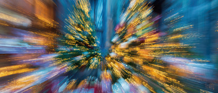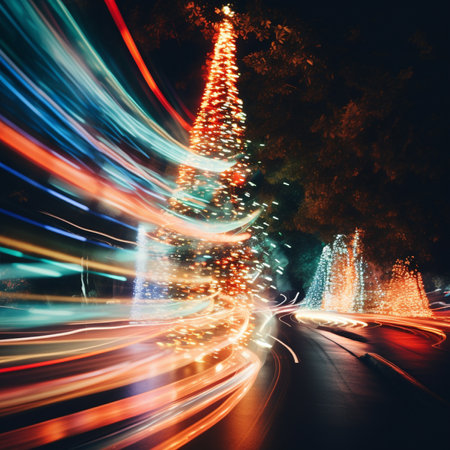 Colorful lights swirl around a Christmas tree creating a joyful and vibrant atmosphere filled with holiday spirit and excitement.