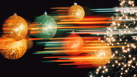 Glittering Christmas baubles in gold, green and red with dynamic light streaks, creating a festive and magical atmosphere. Bright holiday decorations glowing with sparkle and winter celebration spirit