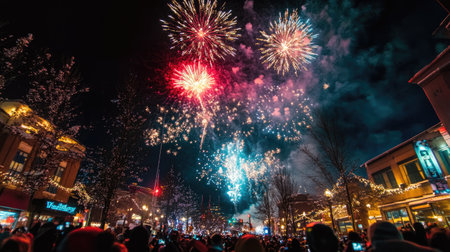 A vibrant fireworks display lights up the night sky above a bustling city street filled with spectators enjoying a festive atmosphere and holiday lights.