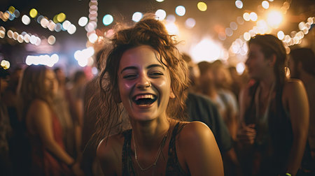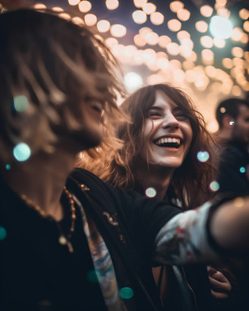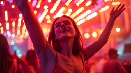 A person smiles brightly while surrounded by colorful confetti during a vibrant party. The scene is filled with joyful energy as lights create a festive atmosphere.