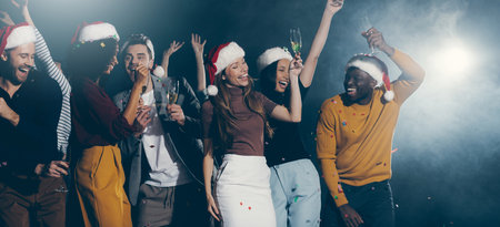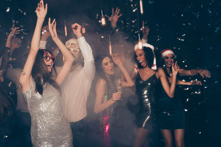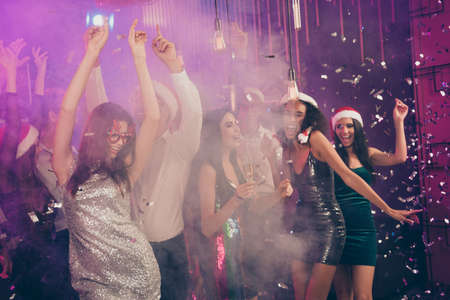 Just dance. Photo of party crowd five best friends holding sparkling wine glasses newyear festive x-mas mood wear dresses shirts pants santa hats in night club