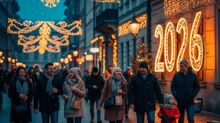 A vibrant winter celebration captures a bustling street adorned with holiday lights. Fireworks burst overhead, bringing joy to the crowds gathered below in the snow.