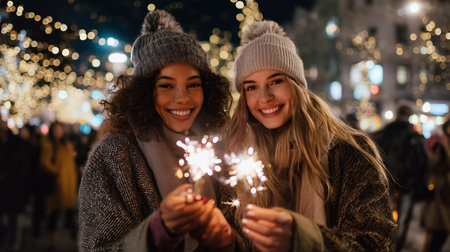 Two friends celebrate the night with sparklers in a festive city square adorned with twinkling lights