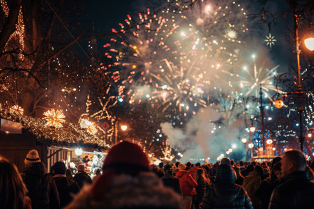A large crowd of people gathers at a Christmas market, looking up at fireworks lighting up the night sky, Festive atmosphere filled with energy and excitement