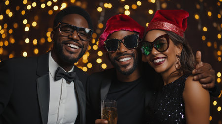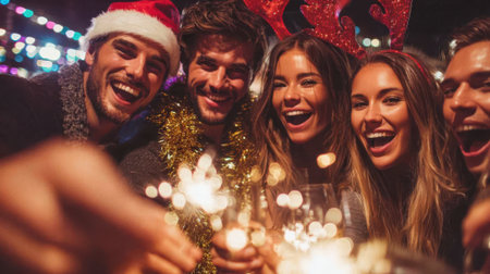 A group of diverse young adults joyfully celebrating a festive occasion, possibly New Years Eve or Christmas, with sparklers and holiday attire.