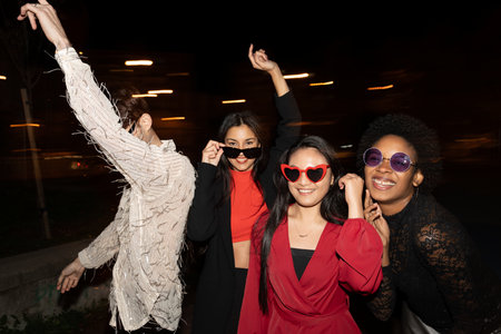 A lively quartet of friends dance joyfully at night, their faces illuminated by the warm city glow.