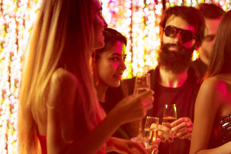 Young, happy, excited friends having fun at the party. New Year celebration gathering
