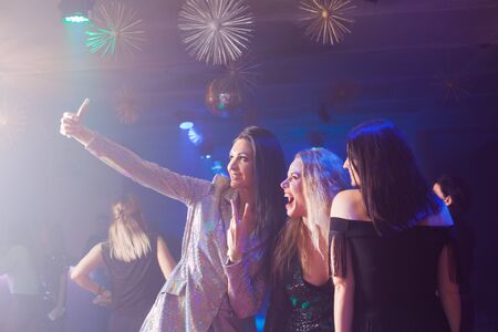 Excited happy women are taking a selfie together in a nightclub using a smart phone