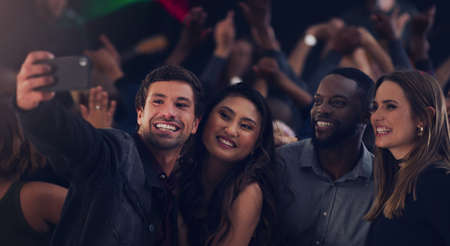 Get in here guys. Cropped shot of a group of young friends taking selfies while dancing together in a nightclub.
