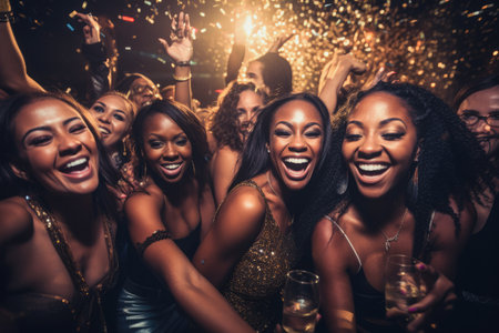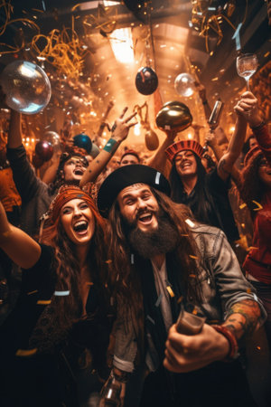 A cheerful group of friends enjoy new year party at nightclub People are drinking, dancing and having a good time at the party comeliness.