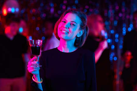 Waist up portrait of smiling young woman holding drink at party in neon lights, copy space