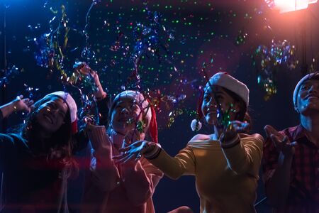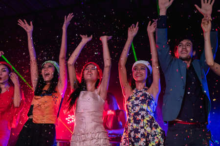 Group Asian young friends dancing showered with confetti together party with Disco lights celebrating Christmas at dark home, Christmas or New Year concept