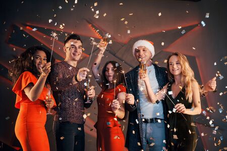 Friends celebrating Christmas or New Year eve party with Bengal lights and rose champagne.