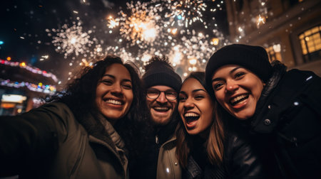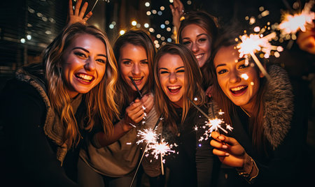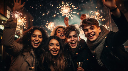 Group of young girls and boys friends celebrate New Year's Eve with drinking glasses with Generative AI