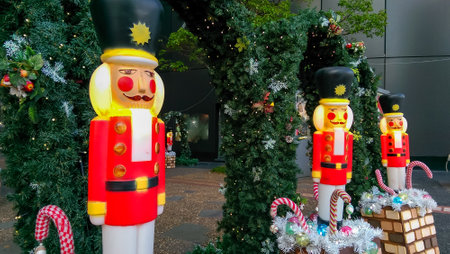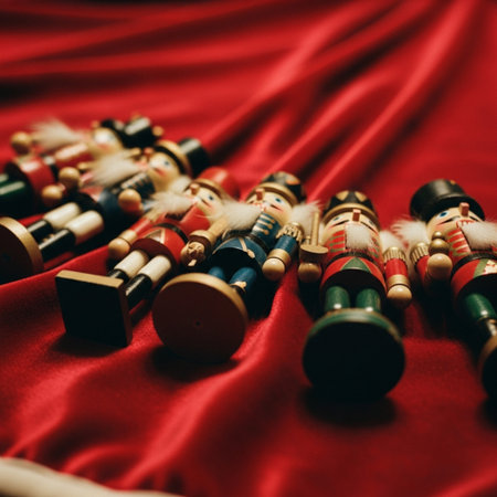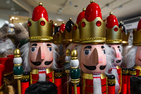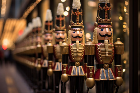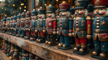 Charming holiday-themed nutcracker figures rest on a stall amid twinkling lights, creating a cozy, joyful atmosphere for seasonal celebrations.