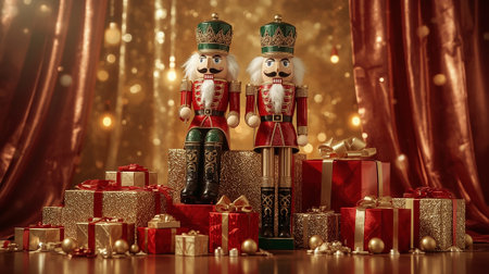 Two festive nutcracker figures standing atop a mountain of wrapped Christmas gifts