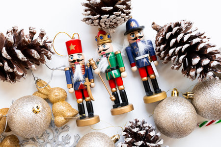 Christmas decoration with nutcracker on wooden background. Christmas greeting card.