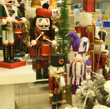Soldier Nutcracker Statues. Decorative toy wooden nutcracker in store during Christmas holidays.